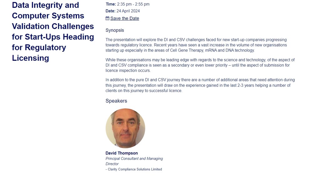 David will be discussing, Data Integrity and Computer Systems Validation challenges for start-ups heading for regulatory licensing.